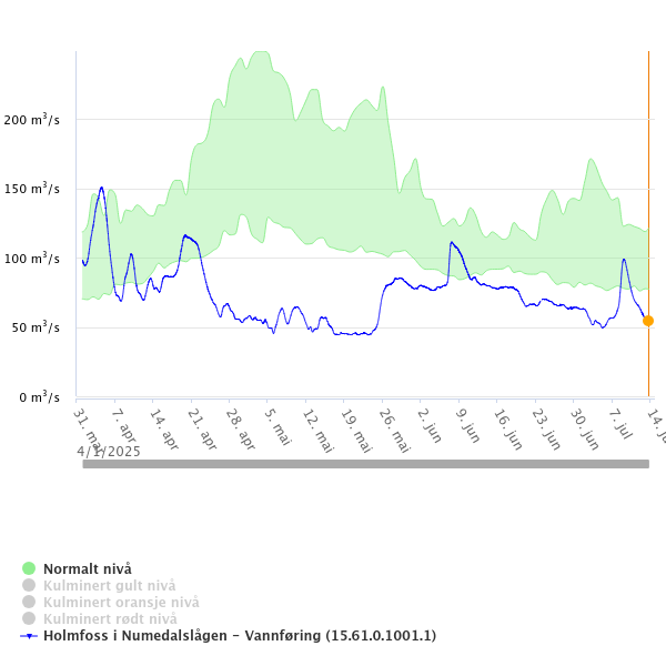 Sesongen 2025 har så langt vært preget av lav vannføring og høy vanntemperatur. Vannføringen reguleres av kraftverkene i vassdraget, med retningslinjer for minimumsnivåer gjennom året. I april var vannføringen sammenliknbar med tidligere år, og selv om det ikke kom noen vårflom ble det observert en markant tidlig lakseoppgang – første laks fanget i Brufoss ble tatt 1. juni. Fra ca 22. april har vannføringen vært vesentlig lavere enn tidligere års normalverdier, og med unntak av to korte perioder har vannføringen vært bekymringsverdig lav i forhold til gjennomsnittlig vannføring. Lav vannføring kombinert med varmt vær og lite nedbør har ført til at vannet i Numedalslågen har holdt en høy temperatur. Lite vann og høy vanntemperatur gjør at laksen holder seg i sjøen, eller holder seg mer i ro og er mindre bitevillig, og dette gjenspeiles i fangstrapportene. I perioden 5. – 7. juli kom en del nedbør som fikk laksen i bevegelse, og i disse dagene økte biteviljen og dermed fangstene vesentlig. Det er god korrelasjon mellom vannføring og rapportert fangst.