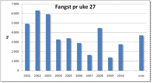 Fangst av laks i Numedalslågen pr uke 27 for årene 2001-2010.